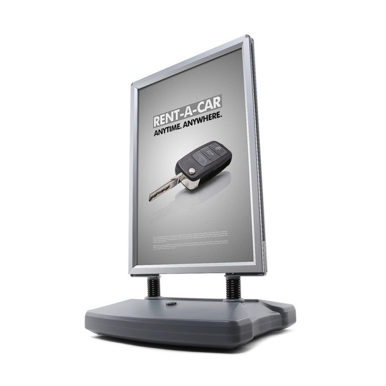 Speziell für Ihre Werbung in windigen Bereichen ist der Kundenstopper WINDTALKER® von Rang Sofortdruck in Oldesloe bei Hamburg, Bad Segeberg, Kiel, Lübeck die optimale Lösung. Sein mit Wasser oder Sand befüllbarer Standfuß bietet in Verbindung mit den Spezialfedern aus Stahl eine hohe Standfestigkeit. Für den einfachen Transport sind im Standfuß Rollen integriert. So können Sie den Kundenstopper trotz des Standgewichtes einfach bewegen. Der Aluminium-Schnellwechselrahmen kann doppelseitig mit Plakaten bestückt werden und garantiert Ihnen auch bei hohen Windstärken eine auffällige Werbemöglichkeit.