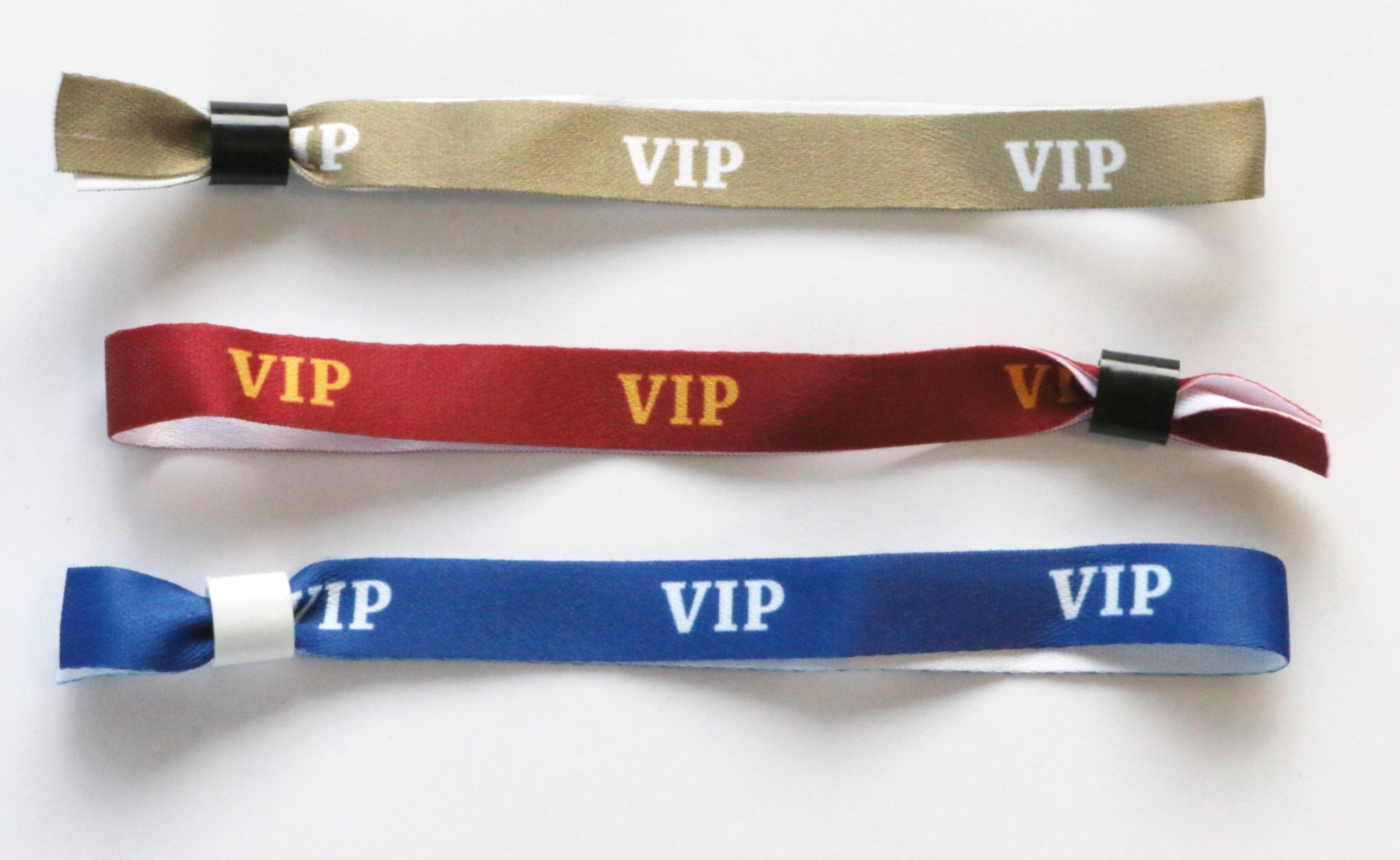 Unsere vorgedruckten VIP-Einlassbänder bestehen aus weichem Polyester und haben einen praktischen Slidelock-Verschluss, der nur in eine Richtng verschoben werden kann. Damit ist das Band nicht übertragbar.