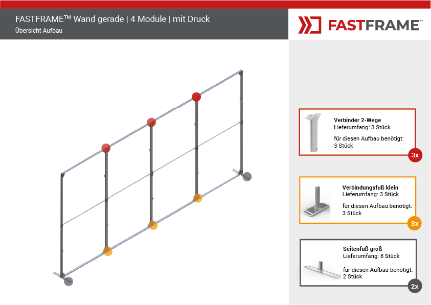 Der FASTFRAME™ gerade Wand mit 4 Modulen ist die ideale Lösung für professionelle Präsentationen, Messen und Events. Dank seines leichten, vormontierten Aluminiumrahmens mit 40 mm Profil lässt er sich in Sekundenschnelle aufstellen – ganz ohne Werkzeug. Eine zentrale Stützstange sorgt für zusätzliche Stabilität, während optionale Standfüße den Halt optimieren.